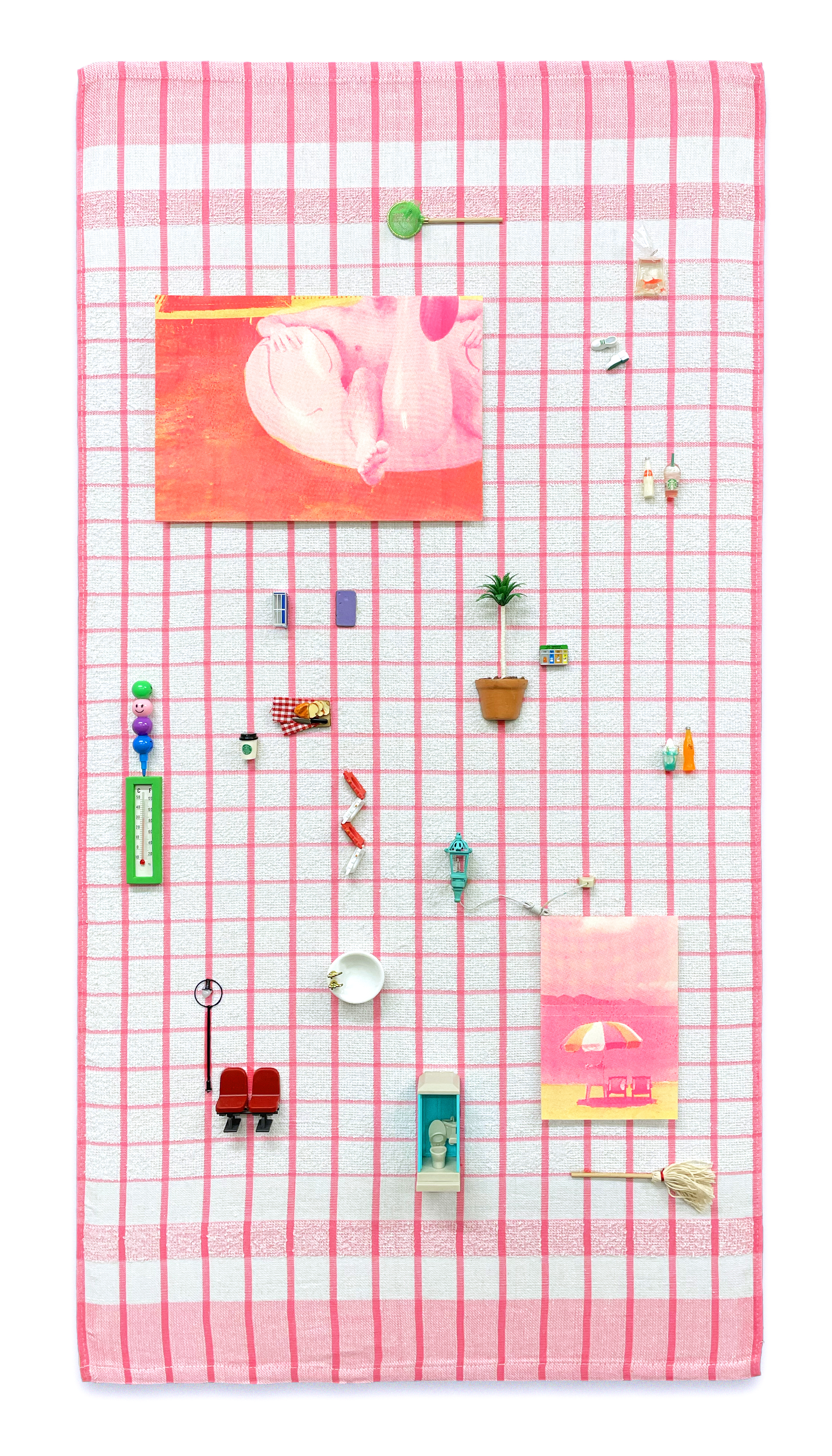 2022, Acrylic, skillscreen print on paper, towel and objects,